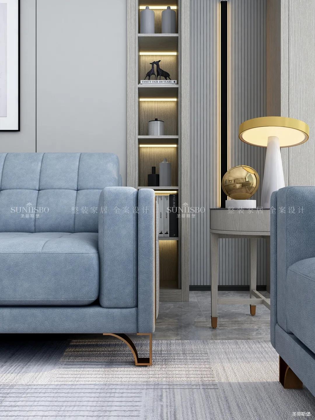 时尚简约与现代简奢的双重美学在客厅中发挥的淋漓尽致,饱满填充的亲肤磨砂皮材质沙发,贴心呵护身体曲线,回家即可来一次舒适惬意的SPA。围绕着时尚、舒适家的设计,剔除了传统简奢金属堆砌,打造定制的实木柜体,在深灰与浅灰之间切换有度,尽显大方自然。