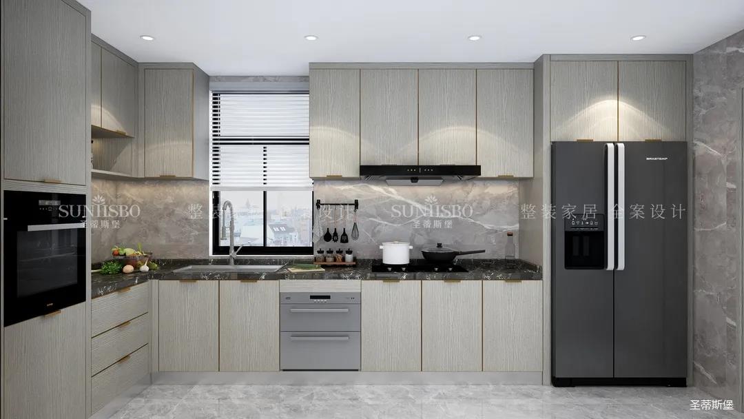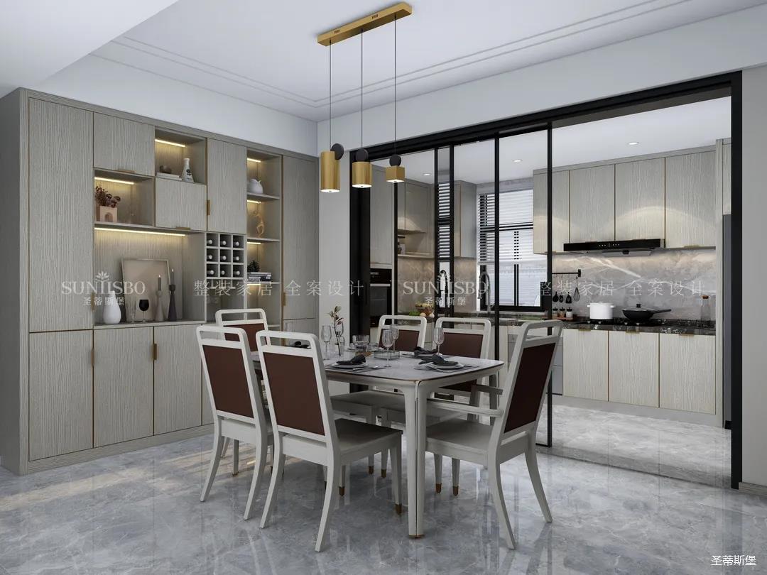 厨房餐边柜的设计不遗余力的表达了收纳充足藏而不漏,空间经过设计斟酌,将木元素作为空间主流,柜体上最能体现质感的岁月纹理,既是工艺升级的表现,又是时尚的标志。